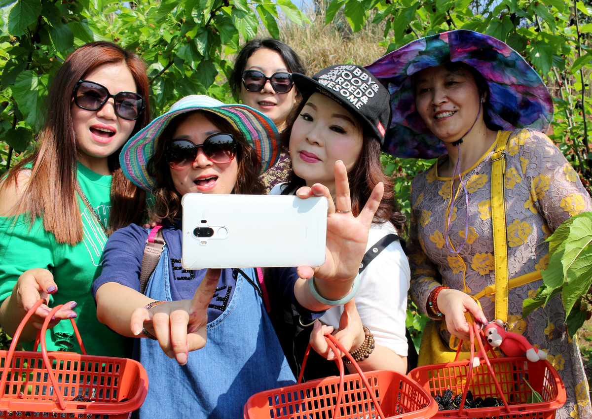 游客在新店乡金鼓村采摘桑葚 李建明 摄