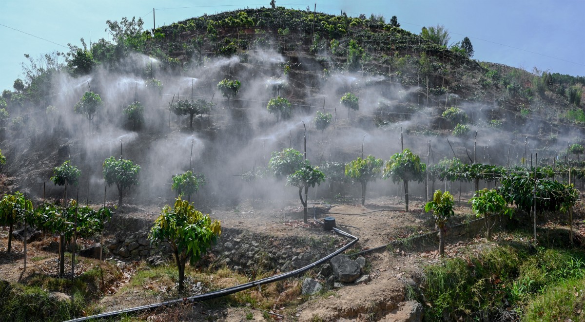 与一般灌溉系统不一样的是,徐庆国芒果地里的喷雾喷头普遍比芒果树高30厘米左右,并且有两个喷头,保证整棵树叶子的正反面都能受药。目前,徐庆国家里有1050棵芒果树安装了该系统。
