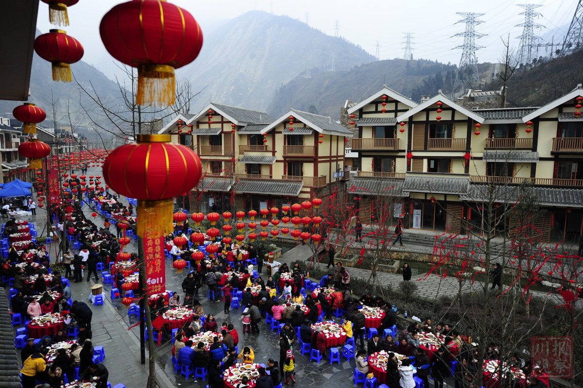 2011年1月31日,映秀镇群众摆起坝坝宴庆祝搬新家。