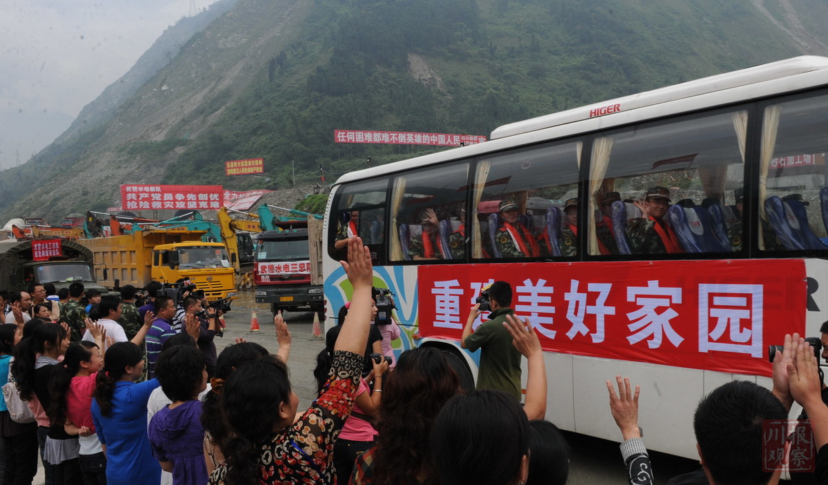 2010年9月6日,武警水电第三总队官兵在映秀镇经过24天连续作战,圆满完成了抗洪抢险任务,当地群众前来欢送武警官兵。