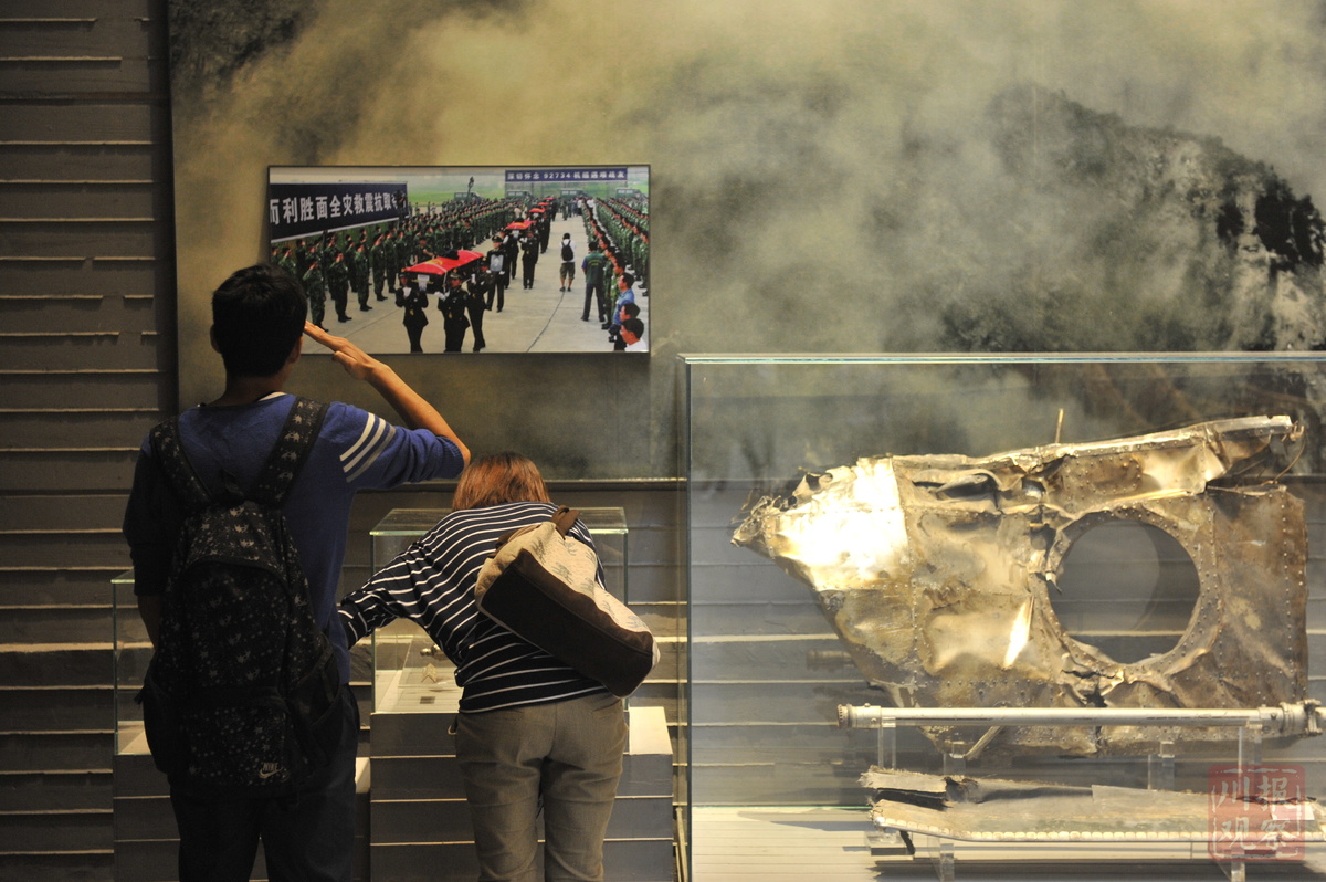 2012年5月12日,汶川县映秀镇,5.12大地震四周年位于映秀的《震中纪念馆》开馆,一位游客在看到邱光华机组失事飞机残骸和遇难照片时向英雄致敬。