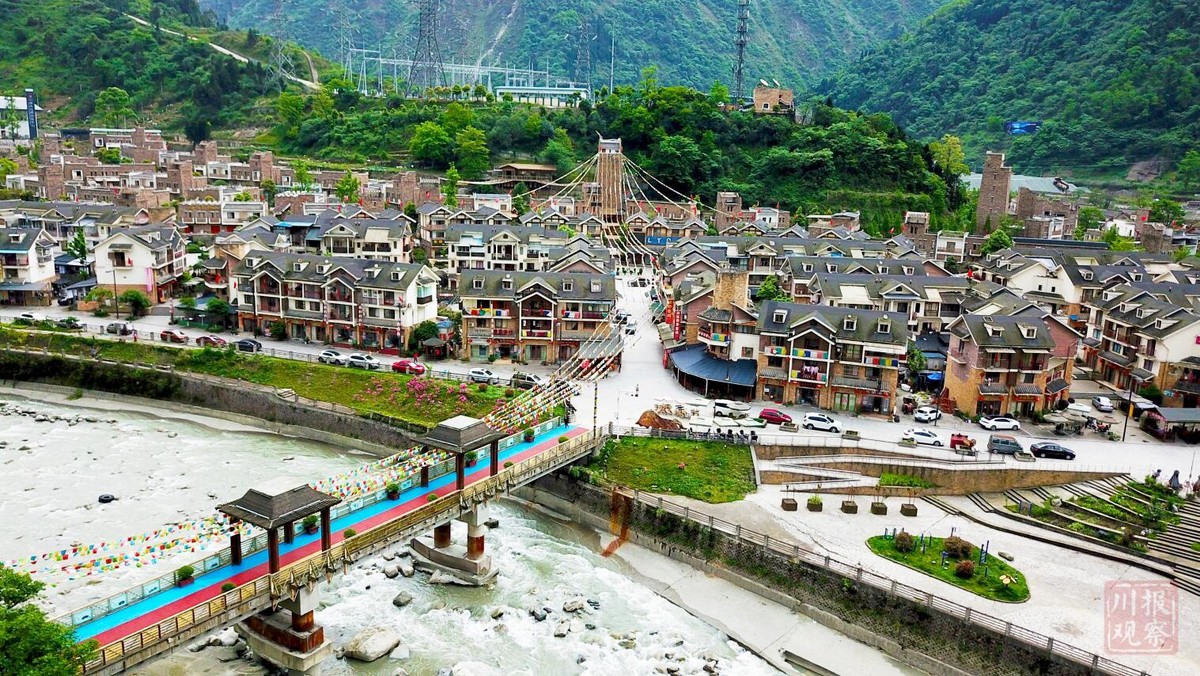 当年地震震中映秀镇重获新生, 一座新城拔地而起。小镇上鳞次栉比的漂亮石楼被打造成餐馆、茶社、旅店。震后,来自全国各地的人们,为映秀的抢险救援和灾后重建付出了巨大心血,正是有了全国大爱的汇聚,才有了映秀的今天。