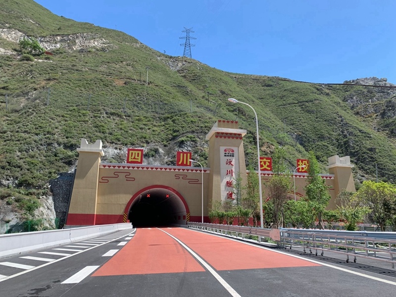 汶川隧道、汶马高速全线第一个隧道,其隧道口形似羌寨碉楼,墙壁上绘有祥云图腾,黄底红边的色彩极其抢眼,民族特色浓厚。