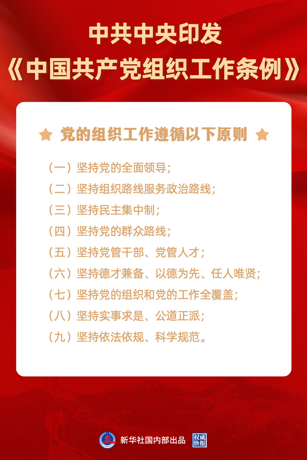 近日,中共中央印发《中国共产党组织工作条例》。条例共46条,分为总则、领导体制和职责、党的组织体系建设、干部工作、人才工作、保障和监督、附则共7章。条例指出,党的力量来自组织,组织严密是党的光荣传统和独特优势。条例对党的组织工作作出全面规范,是做好新时代党的组织工作的基本遵循。