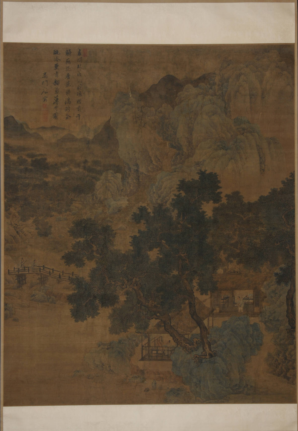 在川博一众馆藏精品书画中显得格外引人注目。这幅作品为绢本设色的青绿山水,远处,绘制了若隐若现的起伏山峦,潺潺溪流蜿蜒于茂林烟雾之间;近处,有浓荫蔽日,深掩茅屋草堂,阁中二叟纳凉清谈,意境清幽。在画面左侧,有作者自题的七绝一首:“虚阁临溪趁晚凉,槛前千斛藕花香。蔗浆满贮金瓯冷,更有新蒸薄荷霜”。落款为“吴门唐寅”,下钤朱文隶书的“唐伯虎”“南京解元”二方印。在七绝开头,还有一方“梦墨亭”的朱色长印。