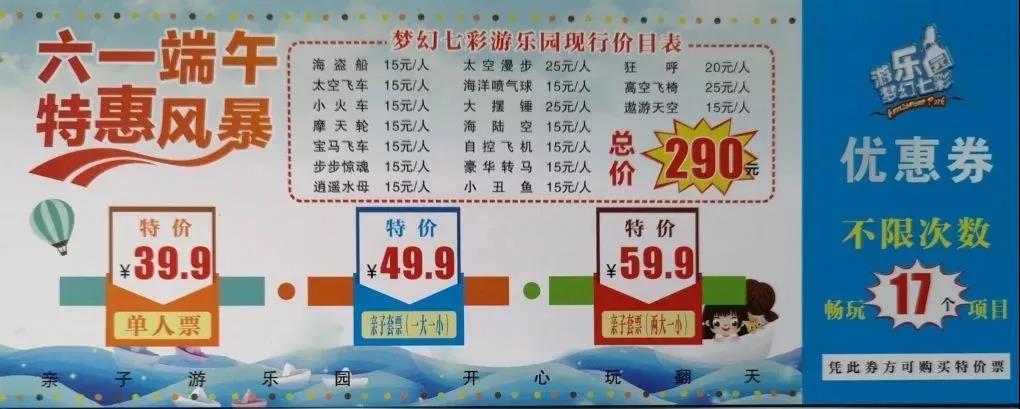 内容:七彩明珠梦幻七彩游乐场在活动日(6月1、2、7、8、9日)游乐设施降价开放,原价要290元的现在只要39.9元、49.9元、59.9元。