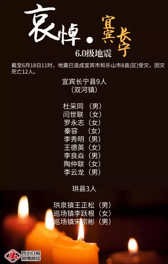据四川省应急管理厅消息,截至6月18日11时,地震已造成宜宾市和乐山市8县(区)受灾,因灾死亡12人。