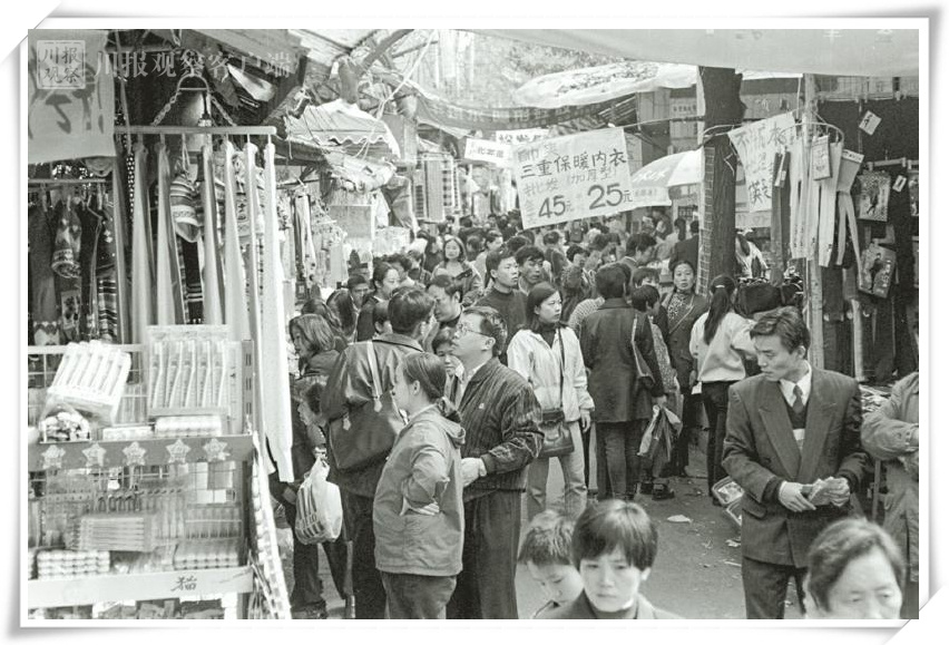 1992年9月春熙路夜市首次开张。一到晚上五点半,摊贩们就推着手推车来街边摆摊。衣服、鞋帽、小吃、温水瓶、饰品……当年你能想到的时尚玩意在这都能找到。