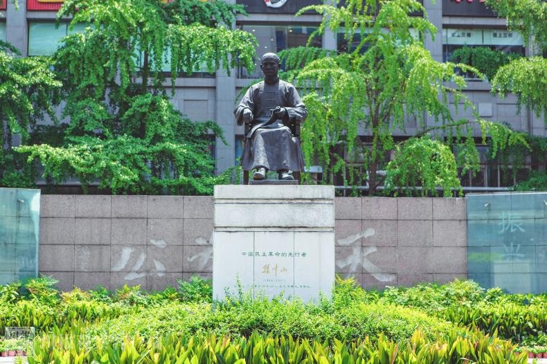 来到春熙路的中心——中山广场上,孙中山先生铜像依旧耸立,见证往来人流日复一日地穿梭汇聚。这座铜像塑于1944年,由著名雕塑家刘开渠先生设计,铜像座高1.8米,孙中山先生着传统长衫马褂,手握一生追寻的《建国大纲》,凝神深思。