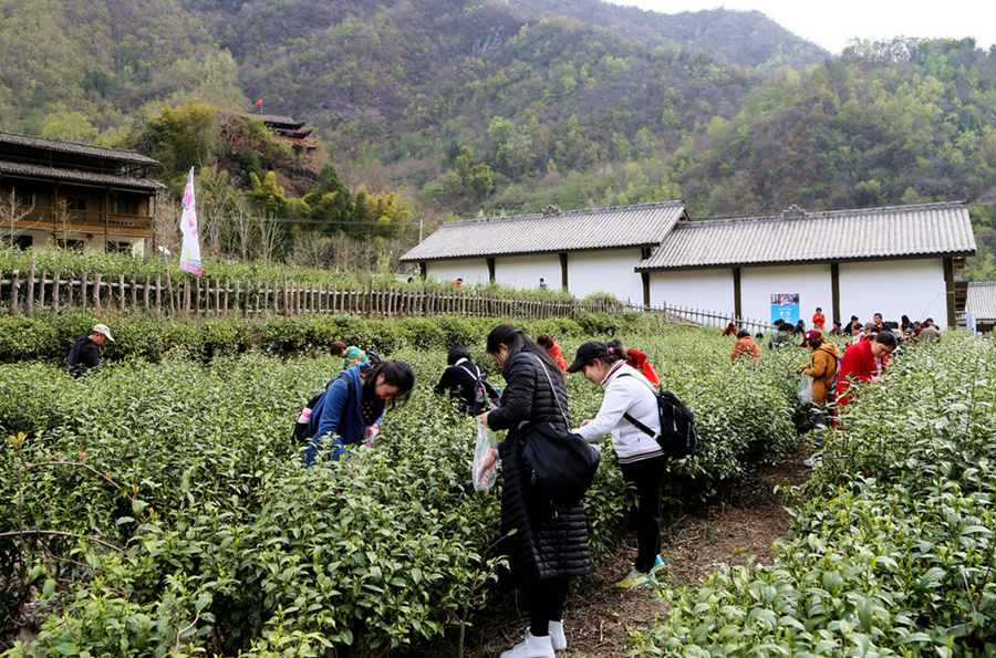 农旅融合,游客在禅茶小镇体验生态绿茶采摘(胡宇 摄)