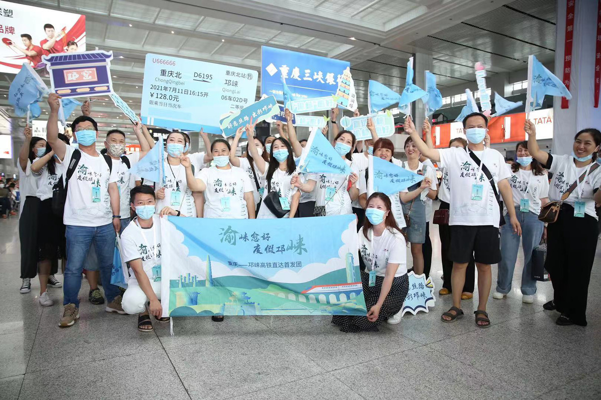 7月11日上午,一列“子弹头”从邛崃站缓缓驶出,全新路线的邛崃—重庆北直达列车正式首发,坚定的向东开往火热山城——重庆。自此,邛崃成为成都市第一个与重庆开通直达高铁的县(市),两地的时空距离缩短到仅3.5小时。这意味着铁路成为邛崃连接旅游目的地和旅游客源地的重要纽带,邛崃也正式加入“轨道上的双城经济圈”。