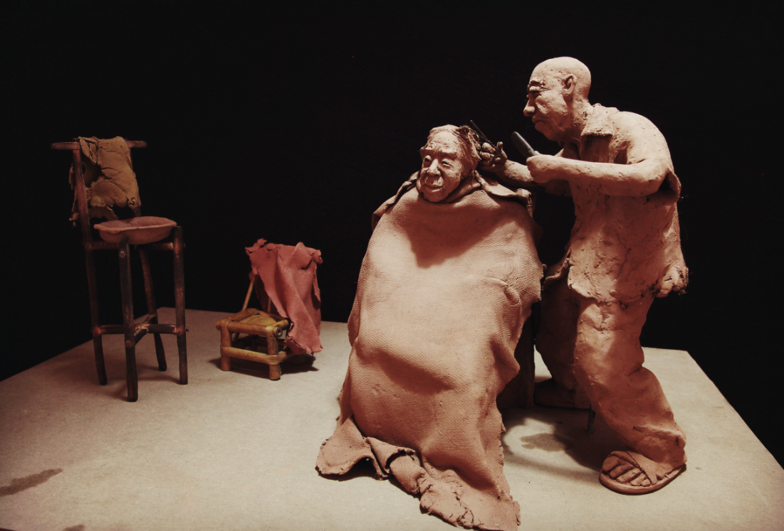 李长青作品《理发》36x25x20cm 泥塑