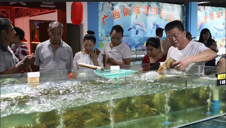 下午4点,记者在广安临港大市场京港海鲜这个面积达2000平米的海鲜卖场看到,里面不断的有广安市民进来观看和挑选海鲜,海鲜池里的基围虾已经售空。在这个卖场里面一共有5个海鲜池,一个杀鱼间、一个三文鱼窗口。据该京港海鲜负责人广安市京港商贸有限公司经理郑洪形介绍,卖场里有海草、梭子蟹、黄金贝等1百多种海鲜产品。在这个卖场的右侧,还有一个宽敞的海鲜餐厅,购买处理好之后的海鲜产品可以直接在餐厅里加工。