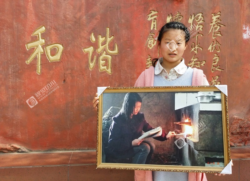 谢静,家住简阳市贾家镇人民村一组。每天放学回家后,她得一手抓学习一手还得帮助妈妈做家务。当时她正冲刺中考,她说:“我一定要考好读高中”。当笔者再次找到她,给她“送图到家”时,她已是四川省重点学校简阳市贾家中学校的一名高中生了。