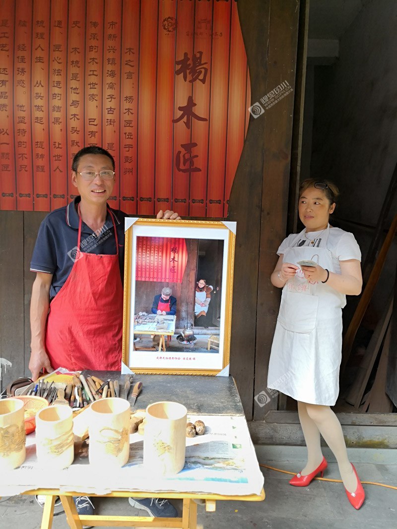 彭州市新兴镇古称海窝子,有位木匠叫杨顶春,他的木雕技艺承袭200多年来的祖辈们。2008年“5.12”汶川特大地震后,为发展海窝子旅游,时年43岁的杨木匠,被镇里和亲人们从深圳召唤回来。杨木匠对根雕、食材工艺雕钩情有独钟,技艺精湛,几年下来,他的事业得到长足发展,也为镇上旅游业出了不少力。他的作品已远销美国、英国、法国、港澳台地区。