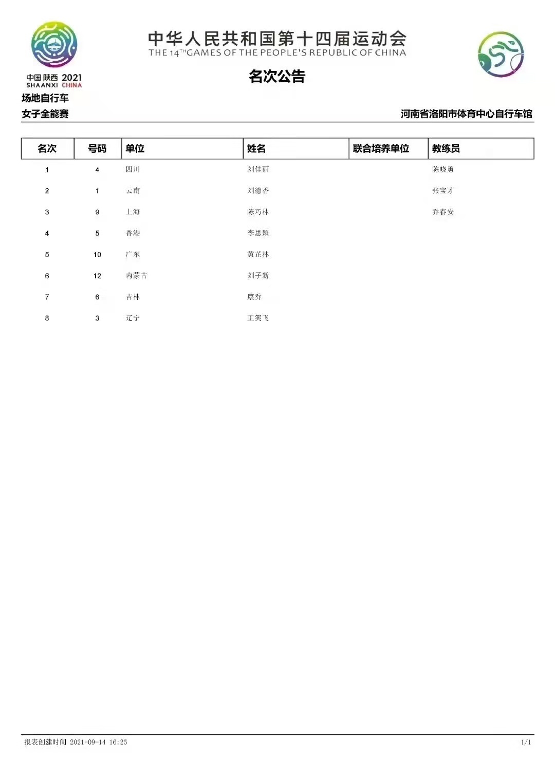 9月14日,第14届全运会场地自行车比赛最后一个比赛日激烈开赛。比赛当天,继前一天获得女子麦迪逊赛金牌后,德阳籍选手刘佳丽在女子全能赛中笑到最后,以140分的成绩再次囊获一枚金牌。这也是刘佳丽本届全运会获得的第二枚金牌。