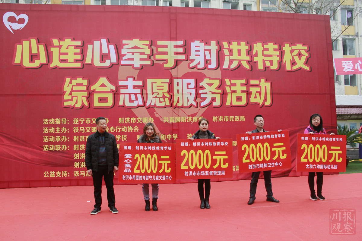 活动现场,射洪市市场监督管理局、射洪市精神卫生中心、太和六幼国际幼儿园、射洪市希望教育留守儿童关爱中心向特校学生分别捐赠了2000元的现金和文体用品;射洪市太涪农业有限责任公司捐赠食品2件,太和中学50多名教师和学生志愿者向特校孩子捐赠了学习用品。
