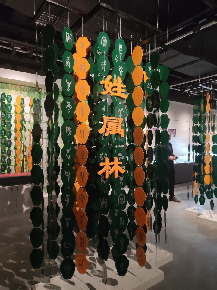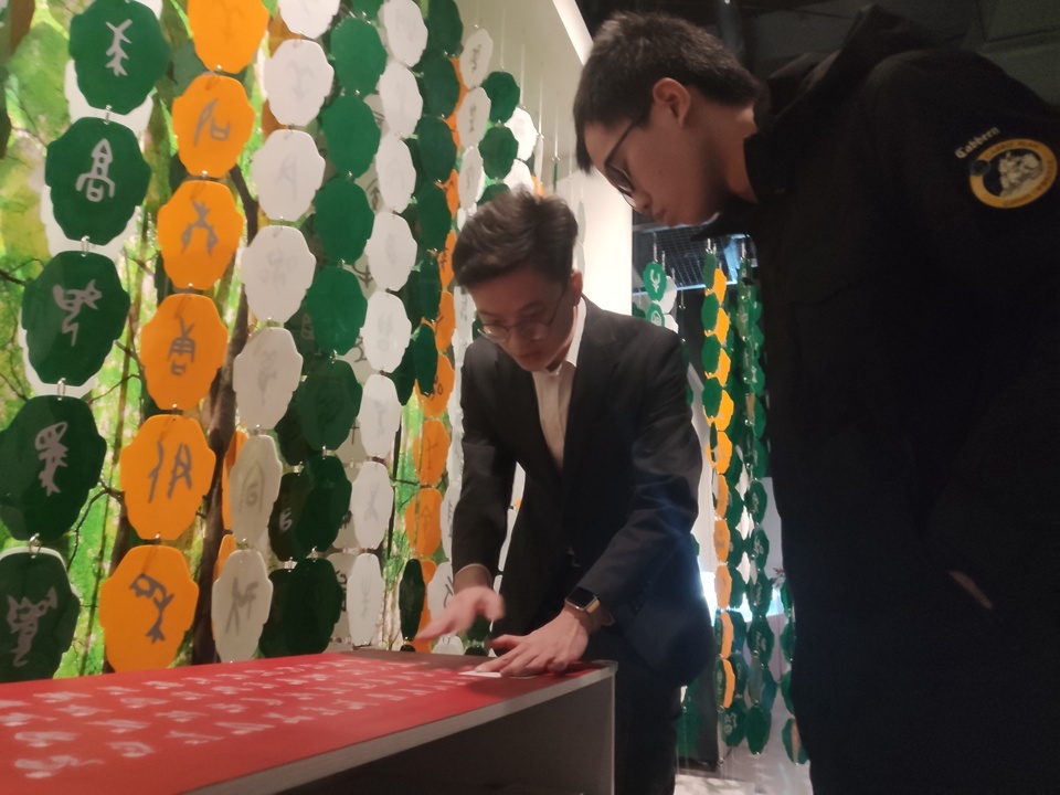 现场,颇多有趣的互动体验区值得打卡。比如展览中的“姓属林”区域以树林场景呈现,属相和姓氏的甲骨文字写在悬挂的叶子上。成片的绿叶洋洋洒洒,观者可以在绿叶中寻自己“姓氏”“生肖”的甲骨文写法。