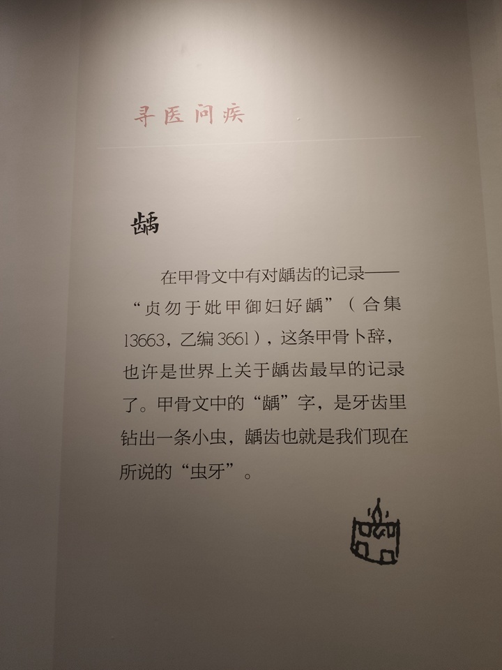 比如,一张嘴巴里面五颗牙,嘴外一个小虫。这个甲骨文字就是我们现在的龋齿中的“龋”字;