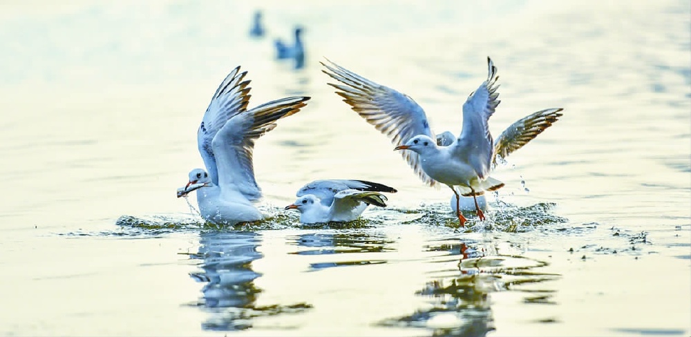 鸟儿在嘉陵江南充段追逐觅食