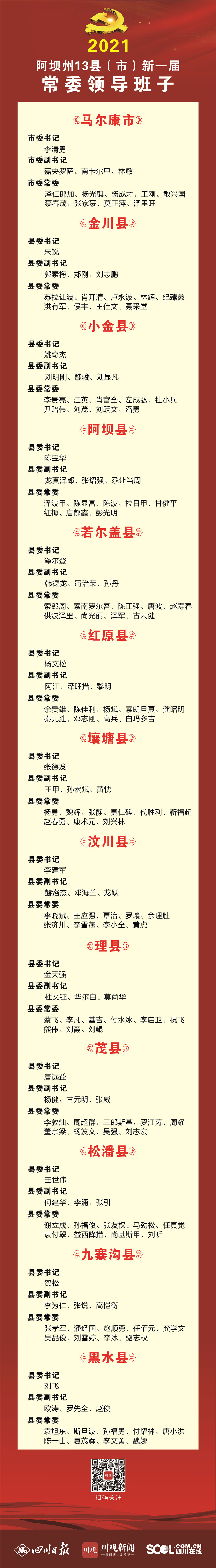 10月31日至11月2日,阿坝州13县(市)陆续召开中国共产党员代表大会,选举产生新一届县(市)委常委会。具体名单如下。