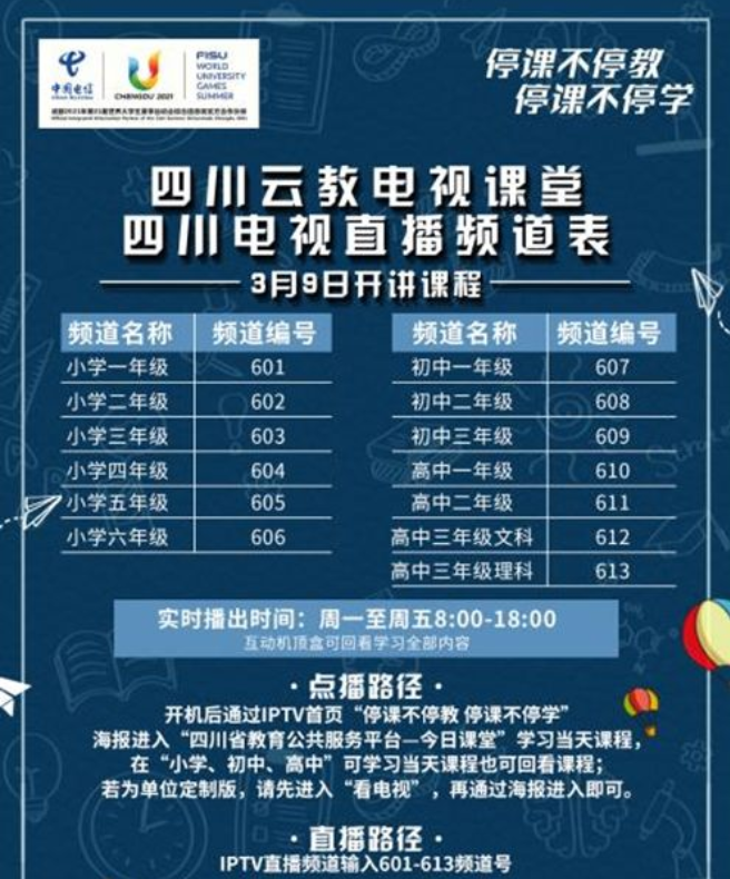在四川电信IPTV直播频道输入601-613频道号即可收看相应课程。详细频道安排如图所示: