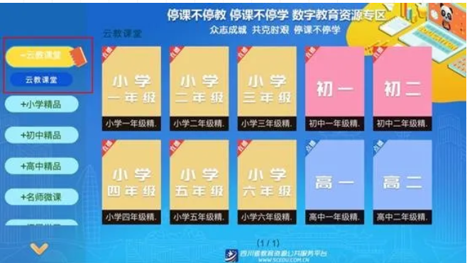 在四川移动IPTV电视上点击首页“停课不停教 停课不停学”数字教育资源专区海报,进入“四川省教育资源公共服务平台”页面,点击左上角“云教课堂”专栏,即可收看直播课程。