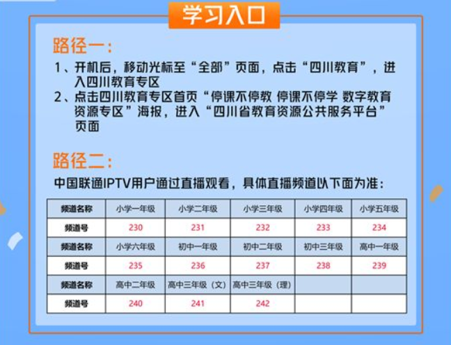 在四川联通IPTV直播频道输入230-242频道号即可收看相应课程。详细频道安排如图所示: