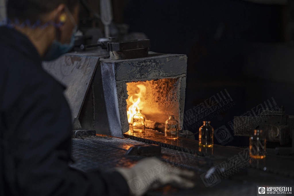 2020年3月11日,阆中光明玻璃制品有限公司成型工段,刚成型的血液制品玻璃包装瓶在进行退火处理。