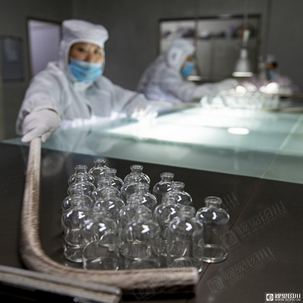 2020年3月11日,阆中光明玻璃制品有限公司,工人在工作台上对血液制品玻璃包装瓶进行复检。