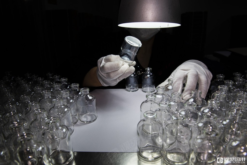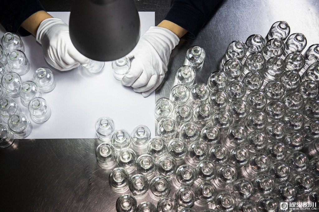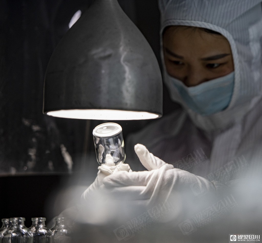 2020年3月11日,阆中光明玻璃制品有限公司,工人在工作台上对血液制品玻璃包装瓶进行抽检。