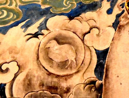 和其他佛不同的是,画面中的炽盛光佛,还有着自己的座驾呢。他乘高轮牛车,车尾斜竖两面龙纹旌旗,右手食指顶金轮,七曜星神四周簇拥,二十八宿列于云中,黄道十二宫悬浮于虚空中。