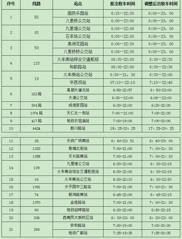 12月10日,记者从成都市公交集团获悉,为深入推进“我为群众办实事”实践活动,实现地铁首末班车时间与接驳公交运行时间相匹配,成都对21条与迎晖路、衣冠庙等地铁站点相接驳的干、支、微、社区巴士等公交线路运营时间进行延时。