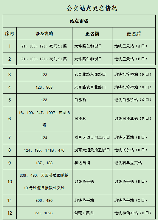 此外,成都公交集团还更名12个公交车站站名与地铁站名同名化,增设6个接驳地铁公交站点,将地铁三元站(A口、F口)、地铁机投桥站(G口)等站外距离较远的公交站台移位至地铁出入口,进一步实现公交地铁站站融合。