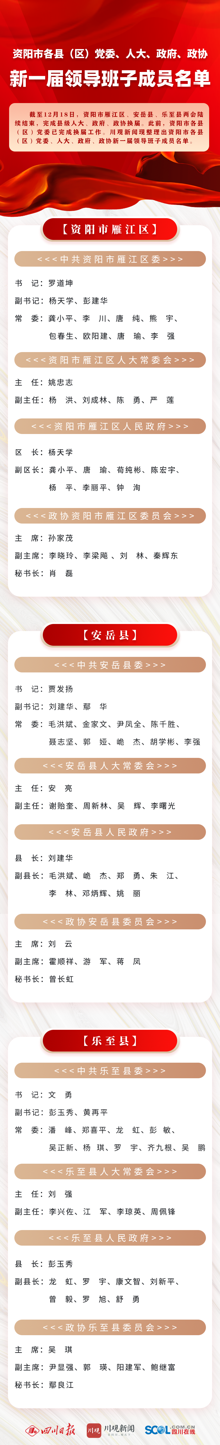 截至12月18日,资阳市雁江区、安岳县、乐至县两会陆续结束,完成县级人大、政府、政协换届。此前,资阳市各县(区)党委已完成换届工作。川观新闻现整理出资阳市各县(区)党委、人大、政府、政协新一届领导班子成员名单。