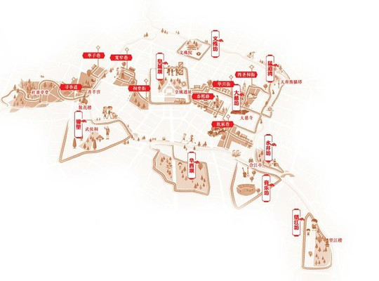 八街包括:寻香道街区、春熙路街区、宽窄巷街区、华兴街区、枣子巷街区、四圣祠街区、祠堂街区、耿家巷街区。