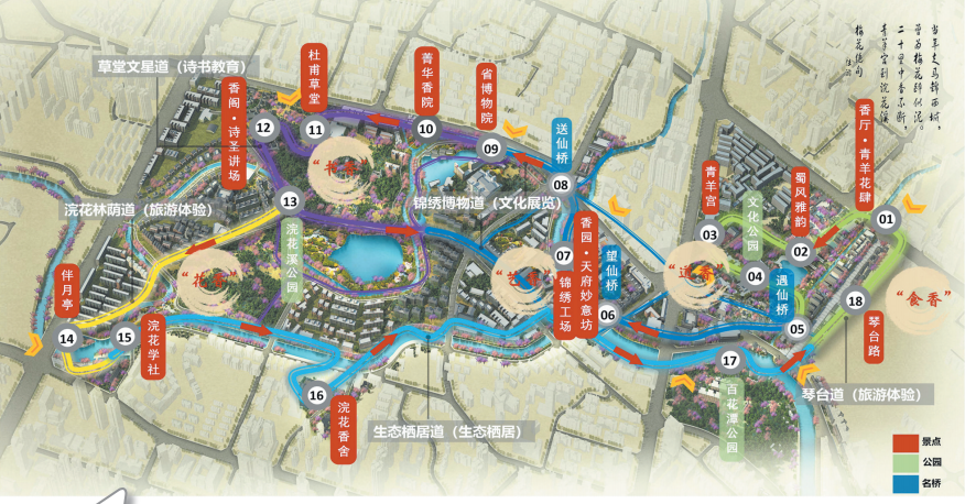 通过梳理城市文脉,成都天府锦城项目规划了“八街九坊十景”,对街、坊、景进行功能业态植入、景观提升、交通改造,意在让历史文化“活在当下”,与新场景结合起来,讲述成都故事。