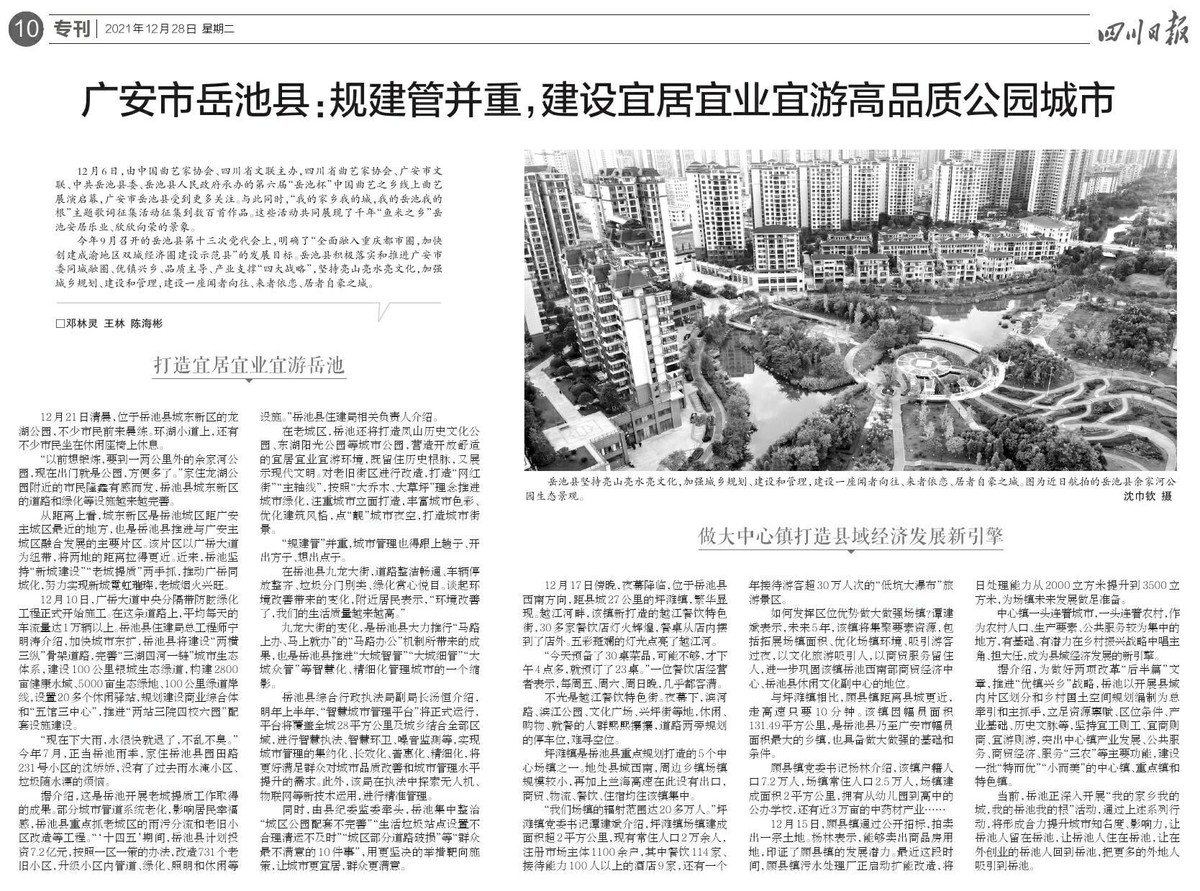 今天出版的四川日报第10版,以《规建管并重,建设宜居宜业宜游高品质公园城市》为题,用半个版的篇幅,记录了岳池县坚持亮山亮水亮文化,加强城乡规划、建设和管理取得的成效。川观新闻转载如下: