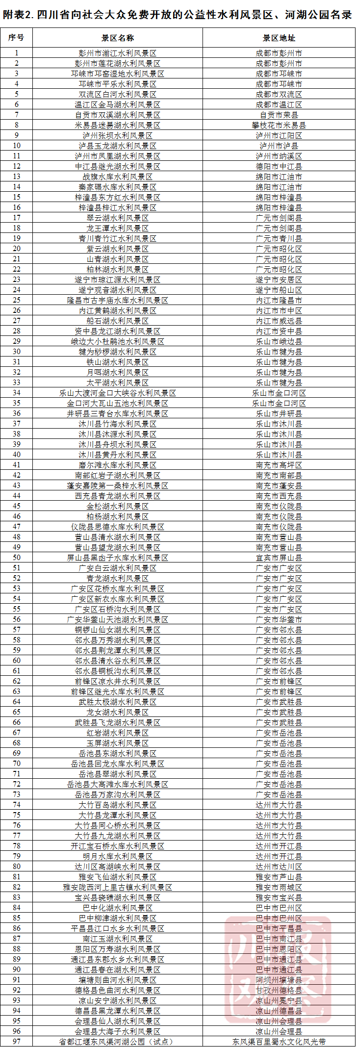 四川向社会大众免费开放水利风景区、河湖公园名单