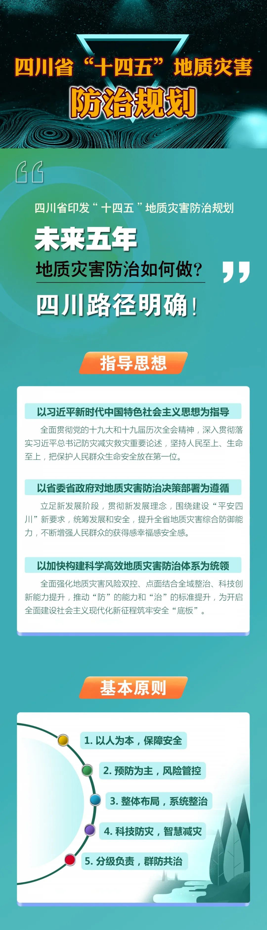 未来五年,我省将围绕建设“平安四川”新要求,以保护人民生命财产安全为主线,以“夯基础、补短板、提质效、增能力、强监管”为基调,全面推动地质灾害“防”的能力和“治”的标准提升,整体提升地质灾害综合防治水平。最大限度防范和化解地质灾害风险,切实保护人民群众生命财产安全,不断增强人民群众的幸福感、安全感,为四川开启全面建设社会主义现代化新征程提供有力的地质安全保障。