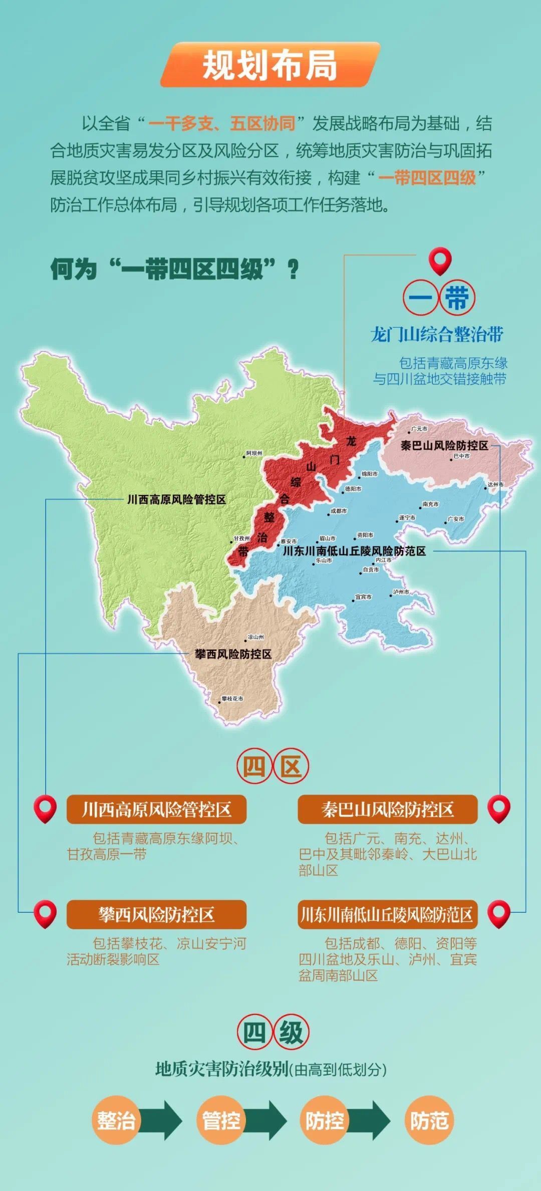 “四区”包括川西高原风险管控区、秦巴山风险防控区、攀西风险防控区、川东川南低山丘陵风险防范区。《规划》根据各个区域的特点,分门别类制定了防灾措施。省自然资源厅相关负责人举例,川西高原风险管控区生态环境脆弱,就要推进高寒山地、植被繁密区防治新技术应用及科技攻关,主要任务是开展地质灾害风险管控;川东川南低山丘陵风险防范区是成渝地区双城经济圈建设“一干多支”核心发展地带,多为中、低地质灾害风险区,防治主要任务是提升科技防灾能力,以避险搬迁为主开展地质灾害综合整治。