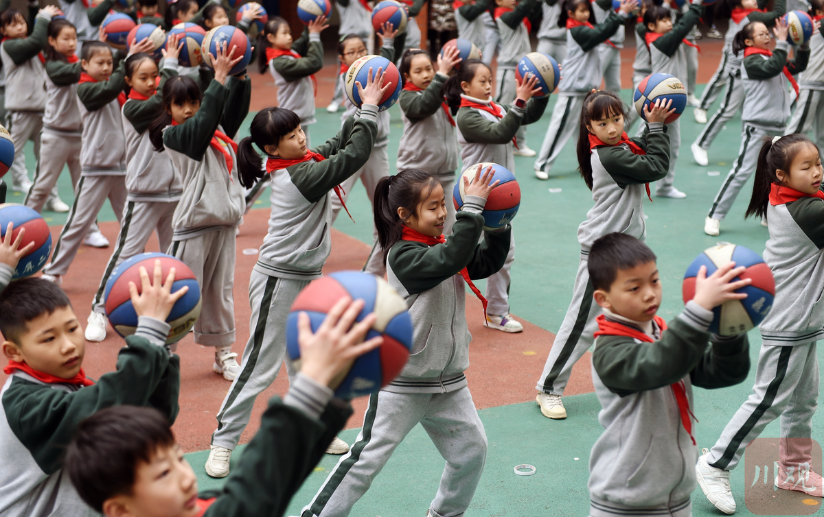 广安市邻水县鼎屏镇第二小学,学生在课间做“篮球操”。康建林/摄