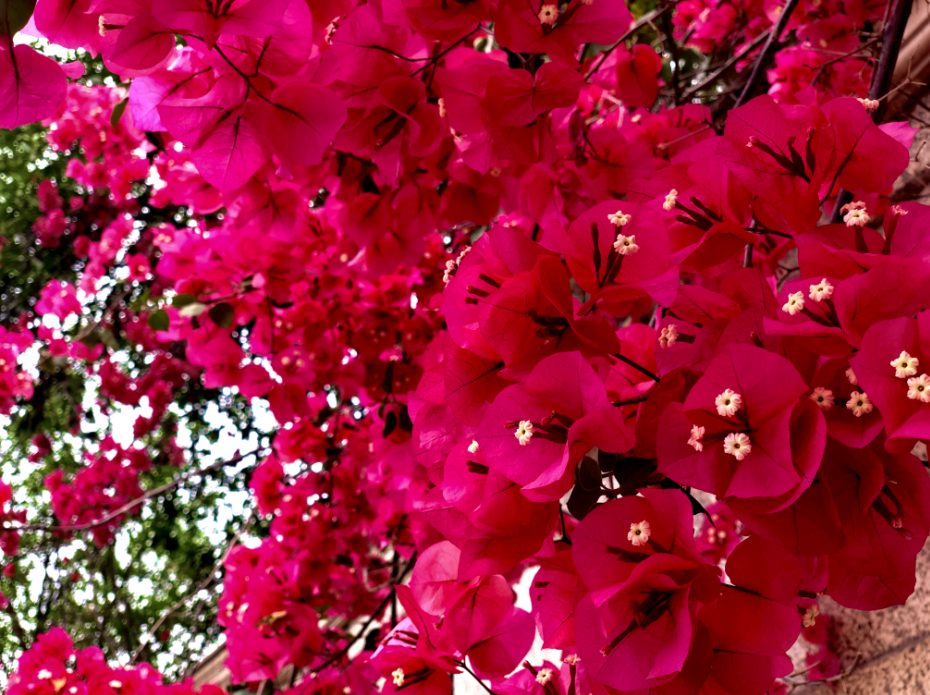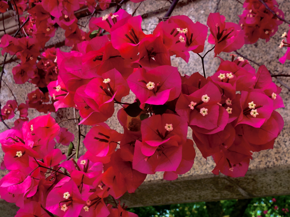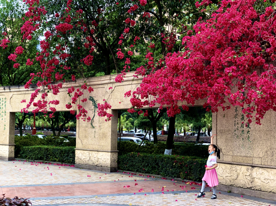 公园入口处一簇簇火红的三角梅、花开正艳,暗香袭人。在微风的吹拂下,花瓣纷纷飘落,如蝴蝶一般缭绕心间。