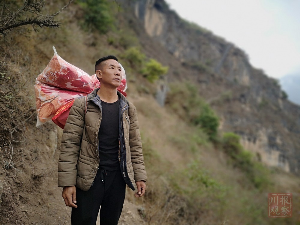 俄的根哈昨天提前进县城搬九件套到了新房,今天凌晨三点才回到悬崖村,脚已经走肿了的俄的根哈睡了两小时又起床,一家人准备下山了。