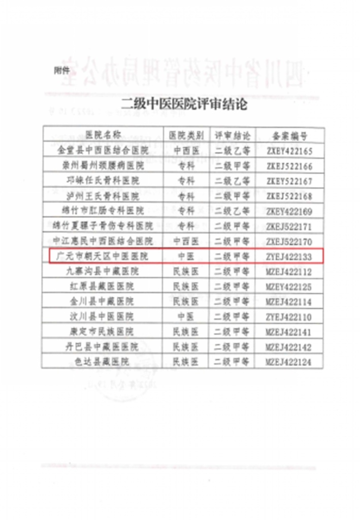 1月19日,四川省中医药管理局办公室正式发布《关于公布金堂县中西医结合医院等中医类医院评审结论的通知》(川中医药办医政便函〔2022〕10号)文件,广元市朝天区中医医院正式创建成为国家二级甲等中医医院。