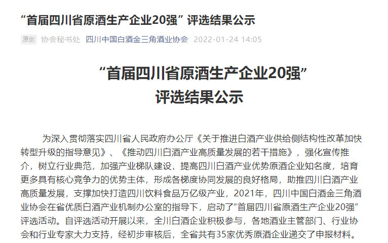 2022年1月24日,记者从四川中国白酒金三角酒业协会获悉,“首届四川省原酒生产企业20强”评选结果进入公示阶段。