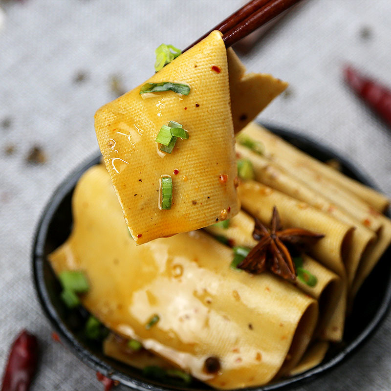 豆腐干在遂宁可谓是无人不晓,是遂宁特色饮食的一张名片,更是大家走亲访友送礼的首要选择。它油亮光泽,纹面细致,松软滑腻,柔绵有弹性,味香质软。五香味色泽金黄,小磨麻油香气浓郁;麻辣味色泽红亮,麻辣爽口,回味悠长,已然成为了遂宁美食的特色品牌。
