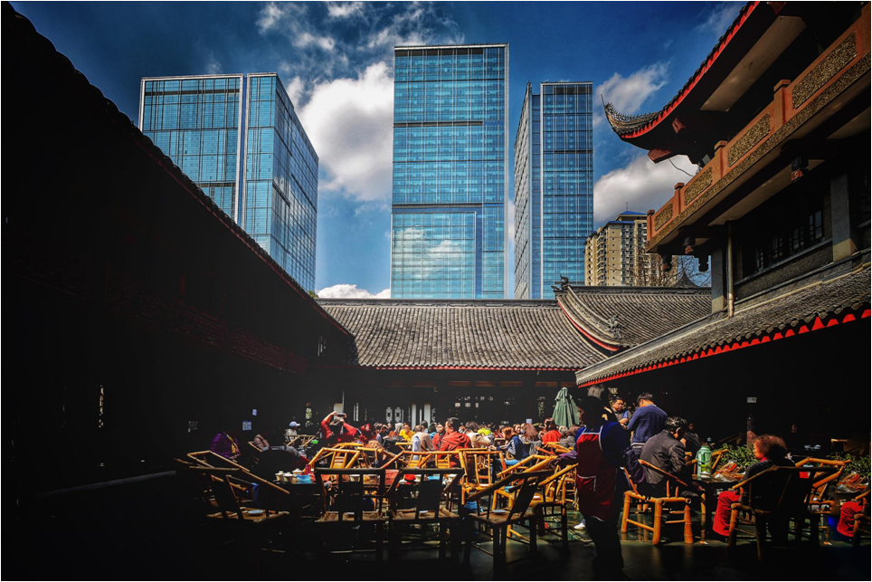 有网友曾这样评价过太古里:“你路过歌帝梵买个甜筒冰淇淋出来对直走两步就进了一千六百多年历史的古寺。然后往右拐去茶馆里要两杯盖碗茶坐在露天里吹水晒太阳,再慢慢把冰淇淋干掉。一切都那么自然。这里,最牛的不是国际奢侈品店,也不是网红打卡地,而是你从国际奢侈品店能直接逛到千年古寺。而这种潮流和历史的混搭,大多数成都人根本感觉不到时空错位,因为已经习以为常了,这才是太古里最厉害的地方。”