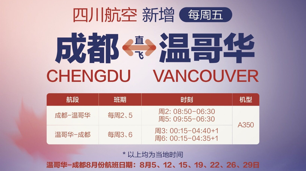 国际方面,川航在符合国家防疫相关规定的前提下,计划于8月15日起新增成都=温哥华加班航班,这样每周成都往返航班将达到2个,其中成都到温哥华每周二、五各一班,温哥华到成都每周三、六各一般,该航班将采用空客350双通道客机执飞。