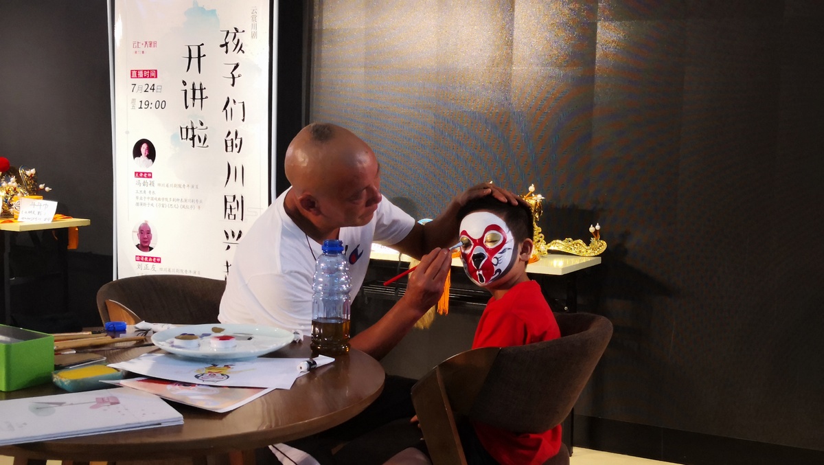7月24日晚,四川省川剧研究院花脸演员刘正友,先在小朋友胖乎乎的脸上画上美猴王孙悟空的脸谱,然后让小朋友拿起一根金箍棒,跟着自己有模有样地比划着,样子好不神气。